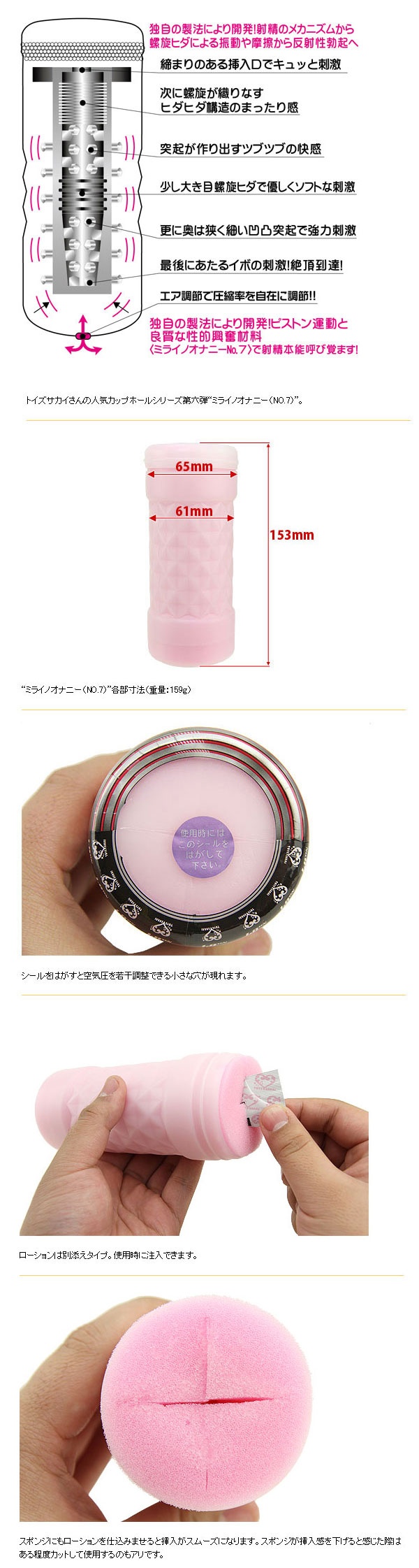 螺旋ヒダによる振動や摩擦から反射性勃起へ導く。今までのミライシリーズのシリコン素材、容器素材を一新し、シリコン素材、容器素材ともにハードタイプになっており、今までのミライシリーズとは一味違う!ハードカップによるハードタイプの刺激が、射精本能を呼び覚ます!