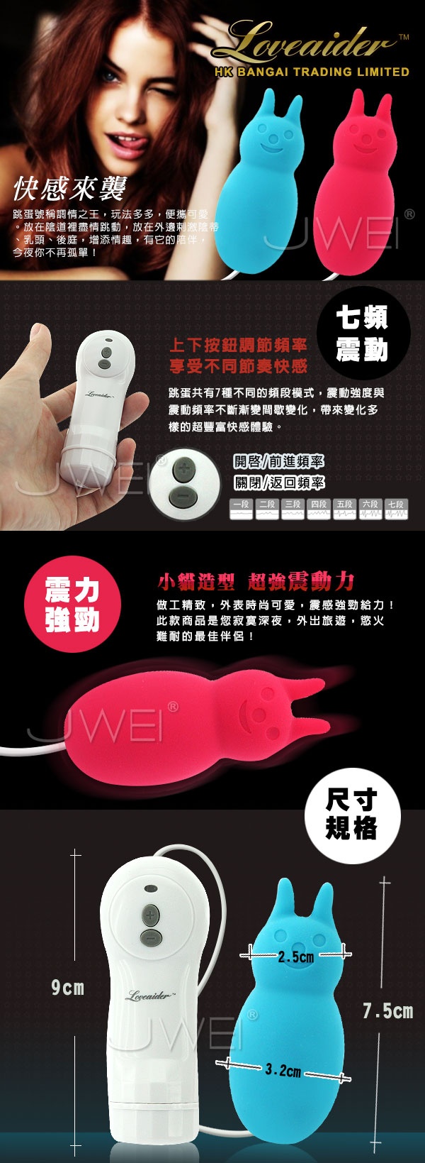 香港邦愛Loveaider2014最新推出的造型軟膠跳蛋,觸感柔細Q彈不死硬,7段變頻靜音馬達,震動力強大,採用高級矽膠安全素材製成,您可以放心使用,無後顧之憂!防水設計,您可以在任何場合使用,清洗時也非常的方便,隨心所慾的操控,讓你獲得更激情、更滿足的性高潮!