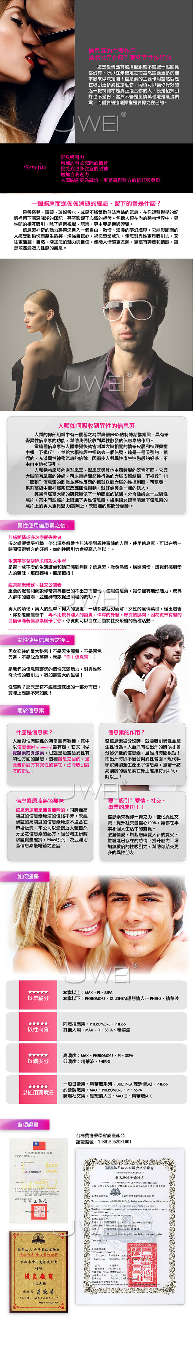 信息素神奇的魅力將帶您進入一個自由、激情、浪漫的夢幻境界。它能讓周圍的人感受到愉悅而產生微笑,更富有 詩意和情趣,讓您散發最魅力性感的氣息。