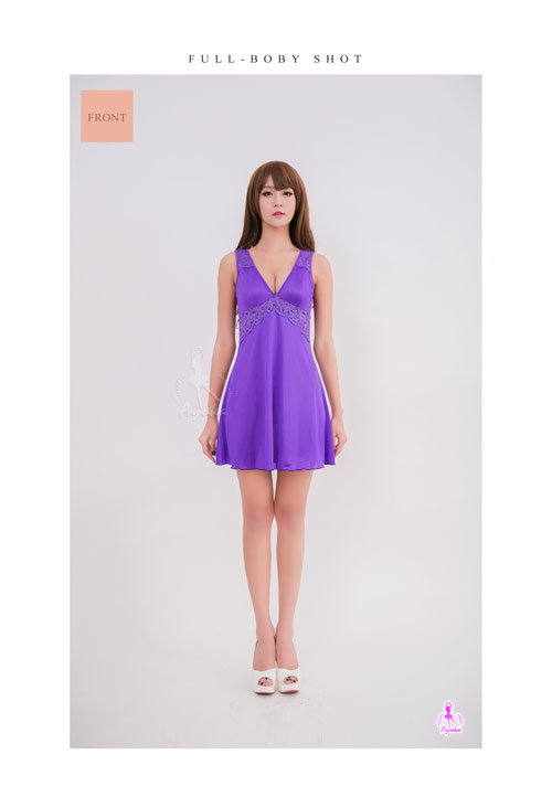 象徵迷情的紫羅蘭色系搭配柔緞材質, 細緻柔滑的觸感呵護每一吋肌膚, 深V領口的剪裁,讓美胸呼之欲出! 獨特精緻的蕾絲點綴在胸下及肩帶, 為整體造型加分,優雅氣質UPUP! 背後V字設計微微露出美背線條, 簡單大方的A字裙剪裁設計, 穿出專屬於妳的性感風采!