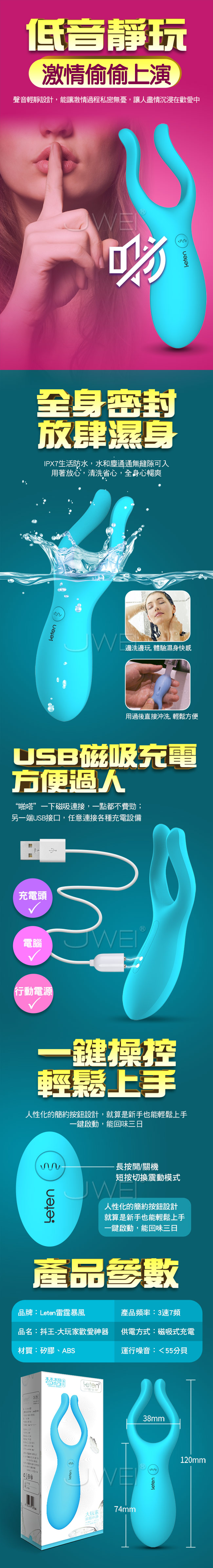■尺寸:詳如下圖所示 ■材質:矽膠、ABS ■供電:USB磁吸式充電 ■三速七頻 ■防水低噪