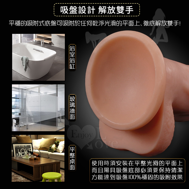 一體成型設計,握感結實,表層細緻Q韌、色澤真實,在底座加上了強力吸盤,可以讓老二棒吸附在任何光滑的表面,不論是玻璃、地板、牆壁等,如此一來您可以使用各種的體位 (坐姿、蹲姿、後背式) 來達到各種不同的高潮體驗。
