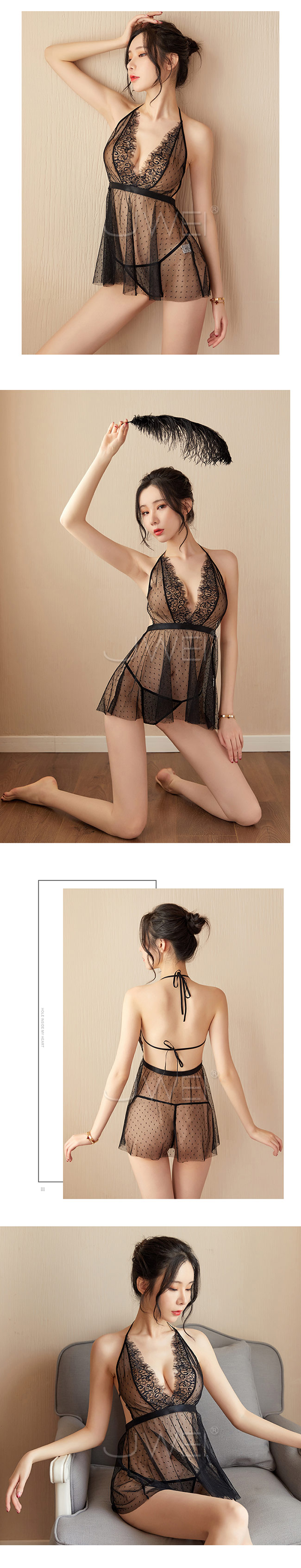 ◇◆午夜倒數.透視蕾絲點點網紗繫帶掛脖睡裙(黑色 )◆◇