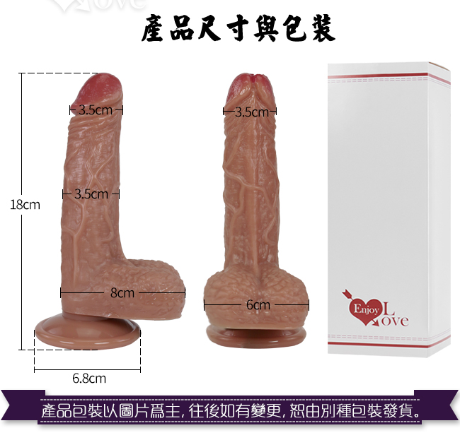 此款逼真老二,屬於細長型,前端龜頭直徑約3.5公分,總長度有18公分,其尺寸最適中東方人來使用,可自由彎曲,絕對能滿足陰道內深度,同時讓妳進出更自在容易。