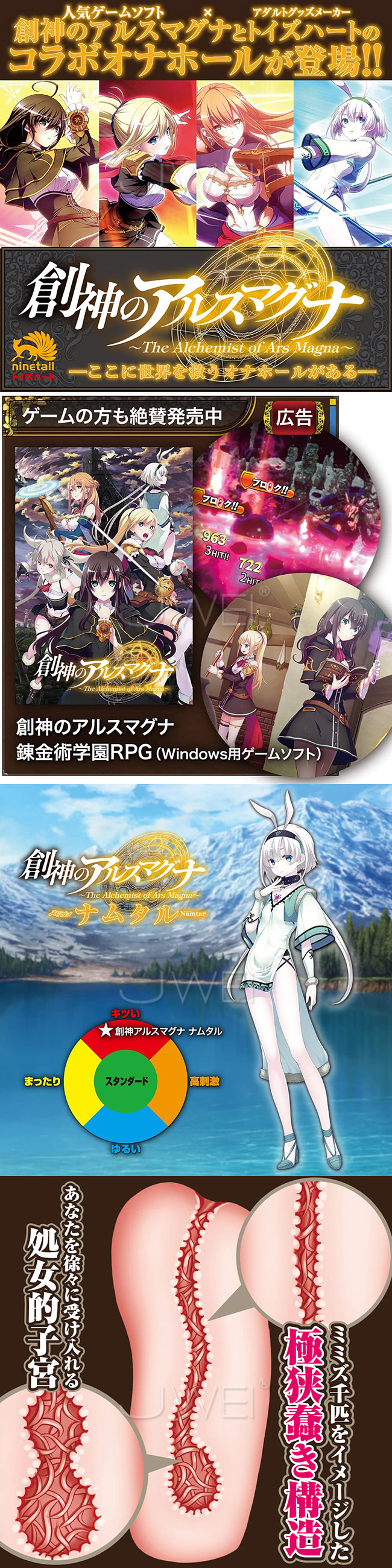 創神的阿爾斯馬格納 ナムタル (創神のアルスマグナ),是少女形態的滅魔,純真的樣子,未開發的蜜穴!其名器的內部構造命名為極狭蠢き構造,即是極之狹窄,極多肉紋之穴!在10.5cm的通道內,佈滿了大量凸起起的肉紋,使你在全程抽插時也能感受極強的磨擦感,完美刺激整根巨龍!