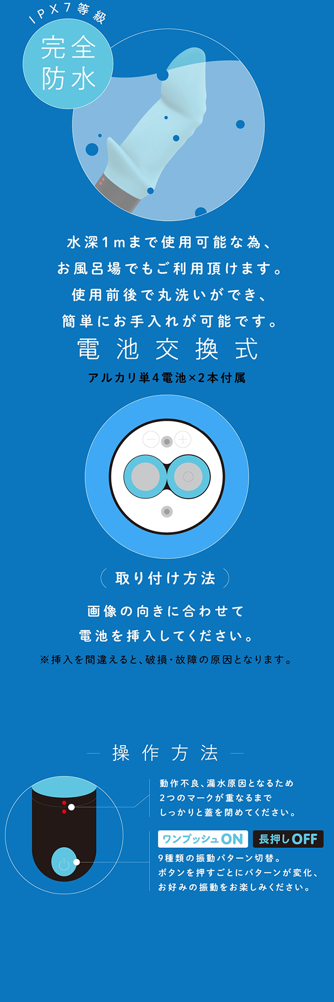 在哪都可以用!完全防水!!具有出色功能的的按摩捧登場!因為是完全防水,根本不用考慮享樂的場地,只有電池就在什麼地方都能使用!加上優秀的靜音性,可以不必顧慮周圍的環境去作使用。而且輕巧易拿,各種設計造型都使用家能夠享受到所喜歡的刺激。IPX7等級。