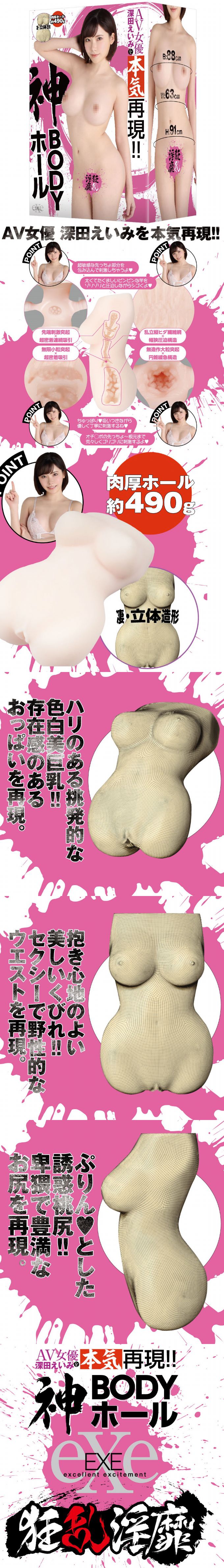 《狂亂淫靡 AV女優 深田詠美真實再現!!神BODY自尉器》 「狂亂淫靡系列」AV女優 深田詠美真實再現的神BODY自尉器登場!!更能體驗深田詠美的真實立體神BODY!!肌膚細白無瑕・美巨乳!!緊緻!美麗的腰身 !!迷人的蜜桃翹臀 !!毫無缺點最棒的自慰器就在這裡!內部構造精準設計插入~發射!!【附屬品】潤滑液