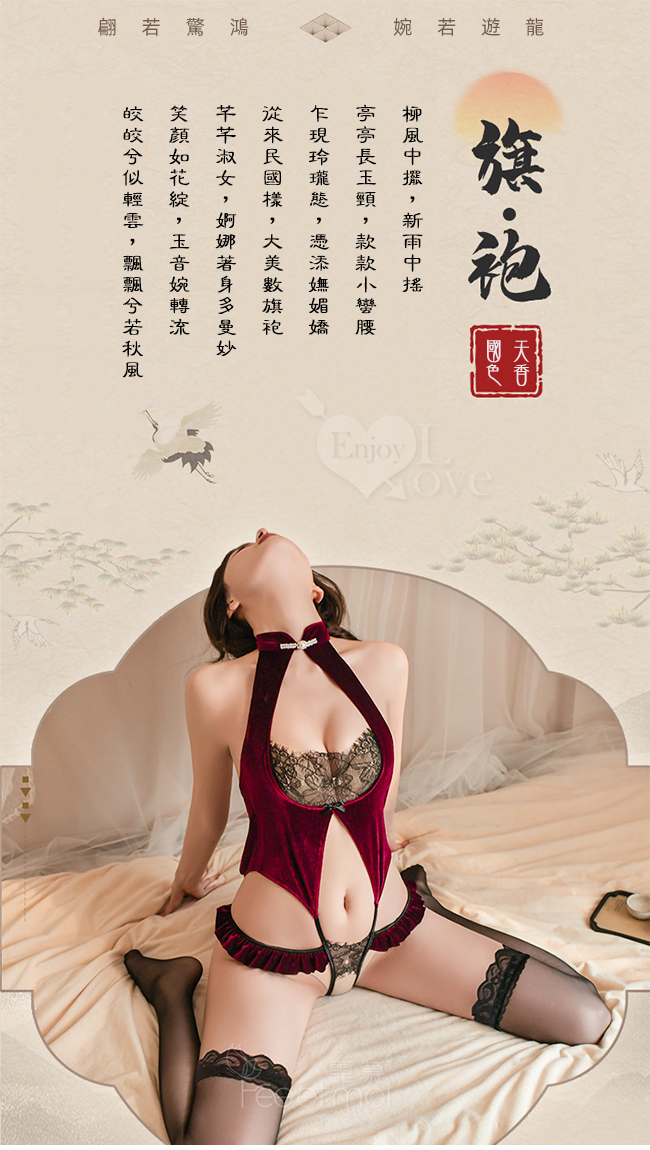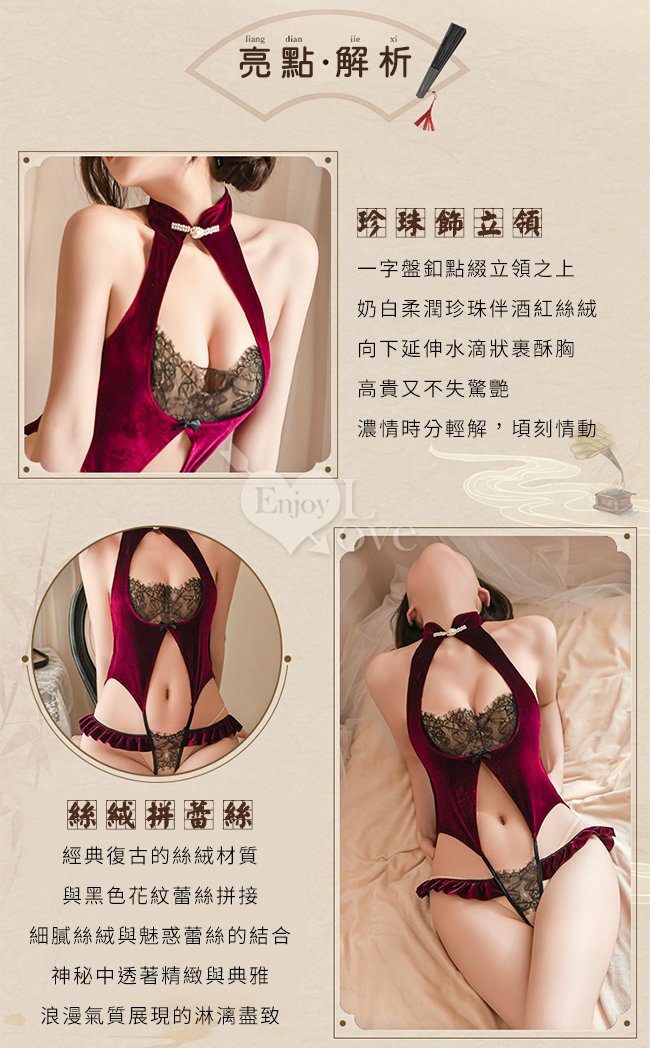 仿旗袍睡衣!一字珍珠領絲絨拼接蕾絲開襠免脫連身衣兩件組
