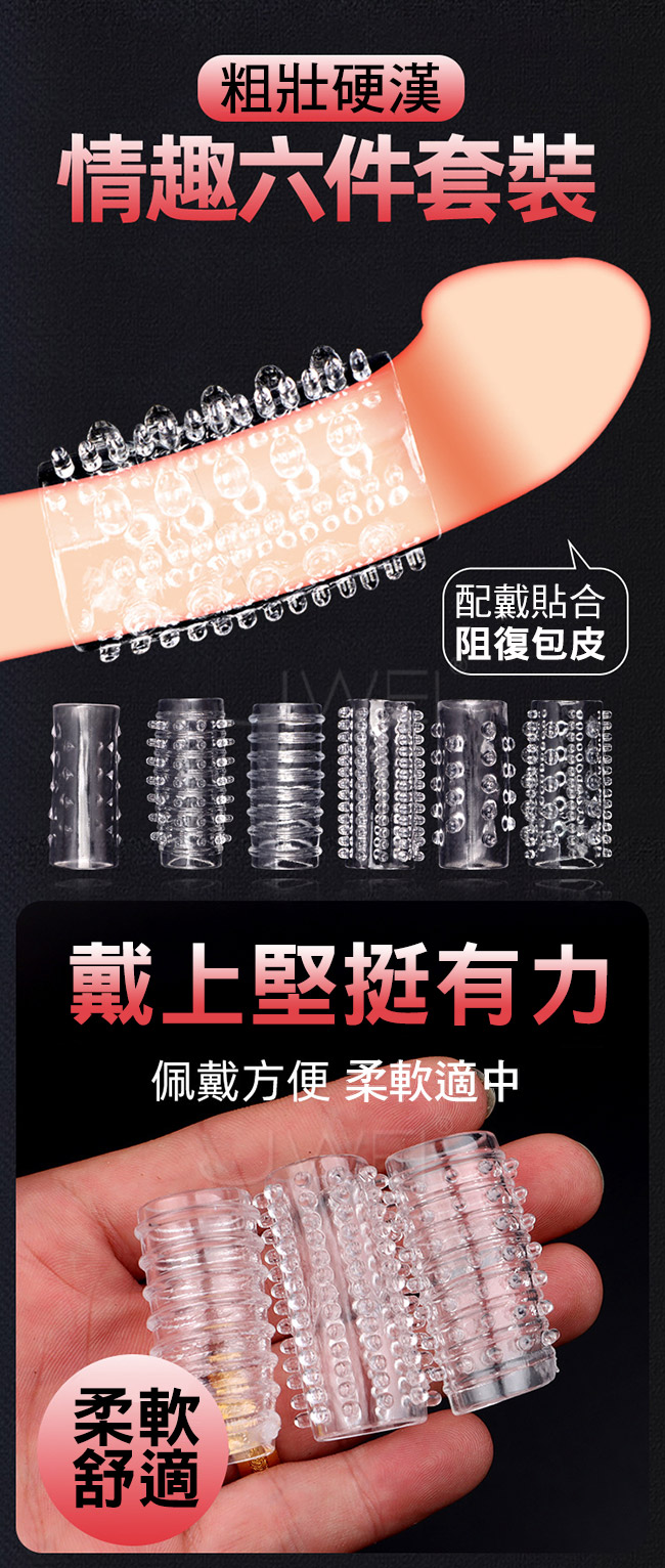 粗壯硬漢,情趣六件套裝,配戴貼合阻復包皮,戴上堅挺有力,佩 戴方便,柔軟材質高彈貼合,柔軟適舒,把守要塞360度環繞貼合 ,多款樣式搭配,不同歡愉感覺!