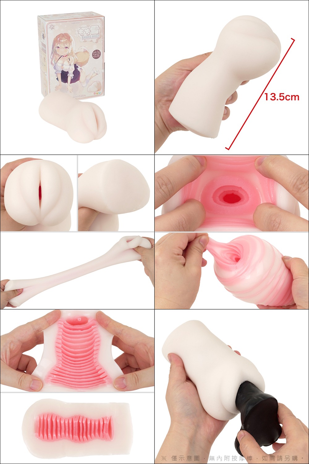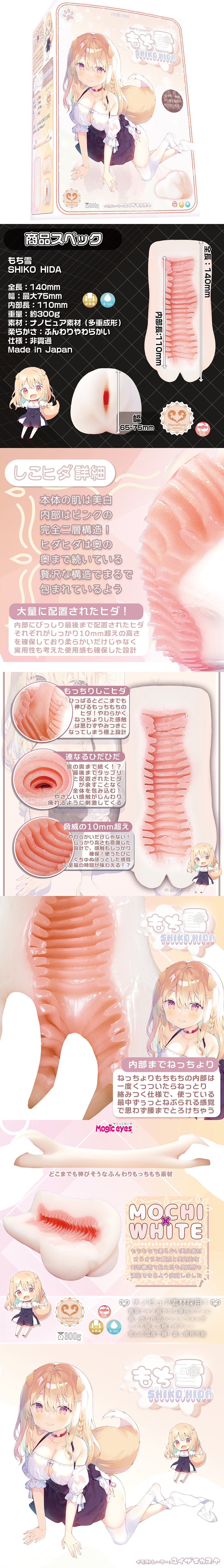又白又軟的獸娘 狗女(もち雪SHIKO HIDA-シコひだ)是一款極度柔軟的名器。其 300g 的重量在保持適中肉感時能簡單操作。內部以大量橫紋的構造,每條橫紋的分隔為 1cm,確保用家能完美地感受一層一層進入時帶給你的刺激感覺。