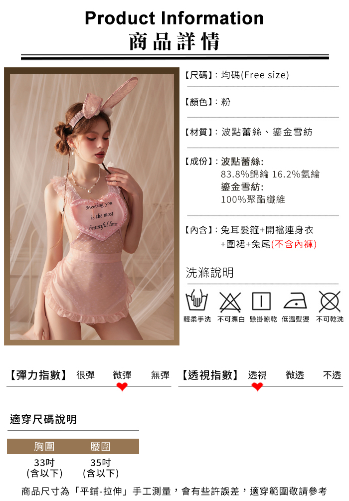 ►您現在的位置:首頁>女僕角色扮演服!俏萌兔耳愛心波點透視開襠連身衣四件式套裝