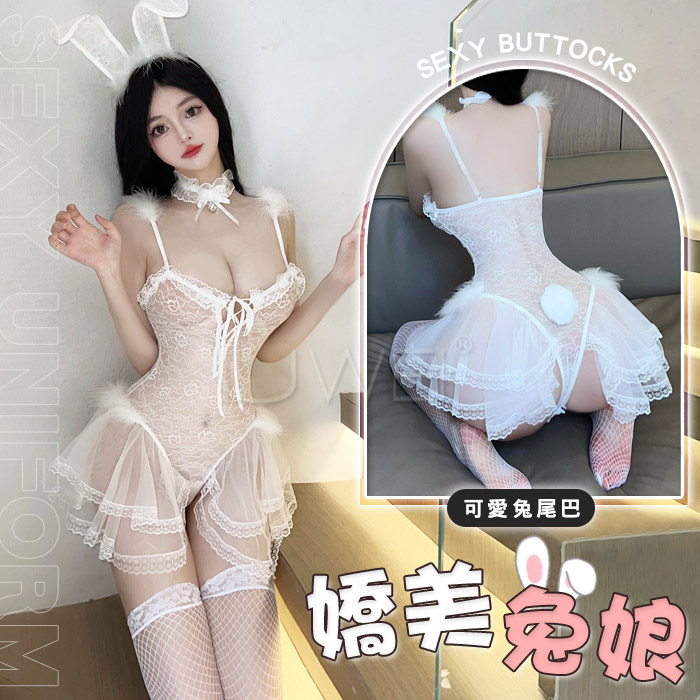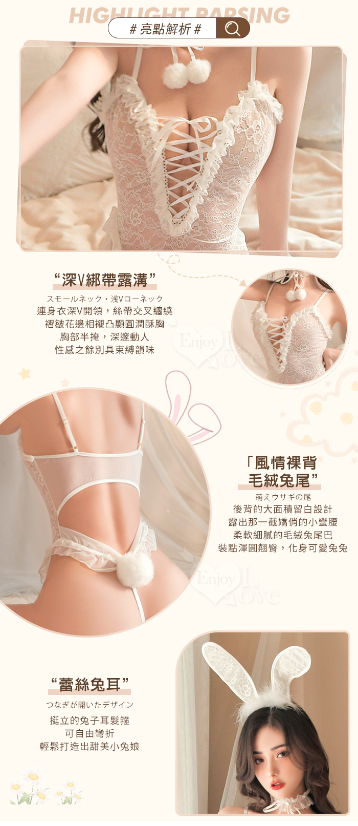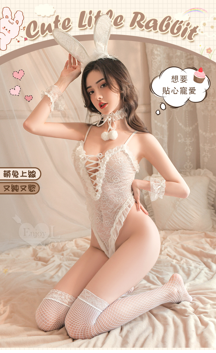 | 兔女郎角色扮演服!毛球頸環V字綁帶美胸木耳花邊連身衣六件式套裝