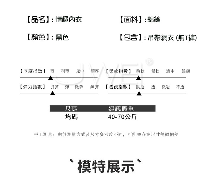 ■內容物:吊帶連體衣 ■適穿尺寸:FREESIZE ■彈性:有 ■未撐開平量尺寸正負誤差1~2cm,1吋=2.54cm ■注意事項:基於保障消費者個人衛生,此貼身衣物恕不接受退換貨。 (如為商品本身暇疵,接受七日內換貨,請勿試穿,謝謝您)