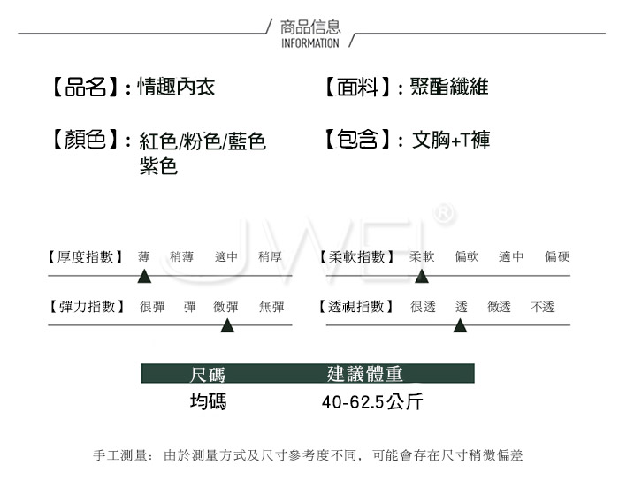 ■內容物:情趣內衣 ■適穿尺寸:FREESIZE ■彈性:有 ■未撐開平量尺寸正負誤差1~2cm,1吋=2.54cm ■注意事項:基於保障消費者個人衛生,此貼身衣物恕不接受退換貨。 (如為商品本身暇疵,接受七日內換貨,請勿試穿,謝謝您)