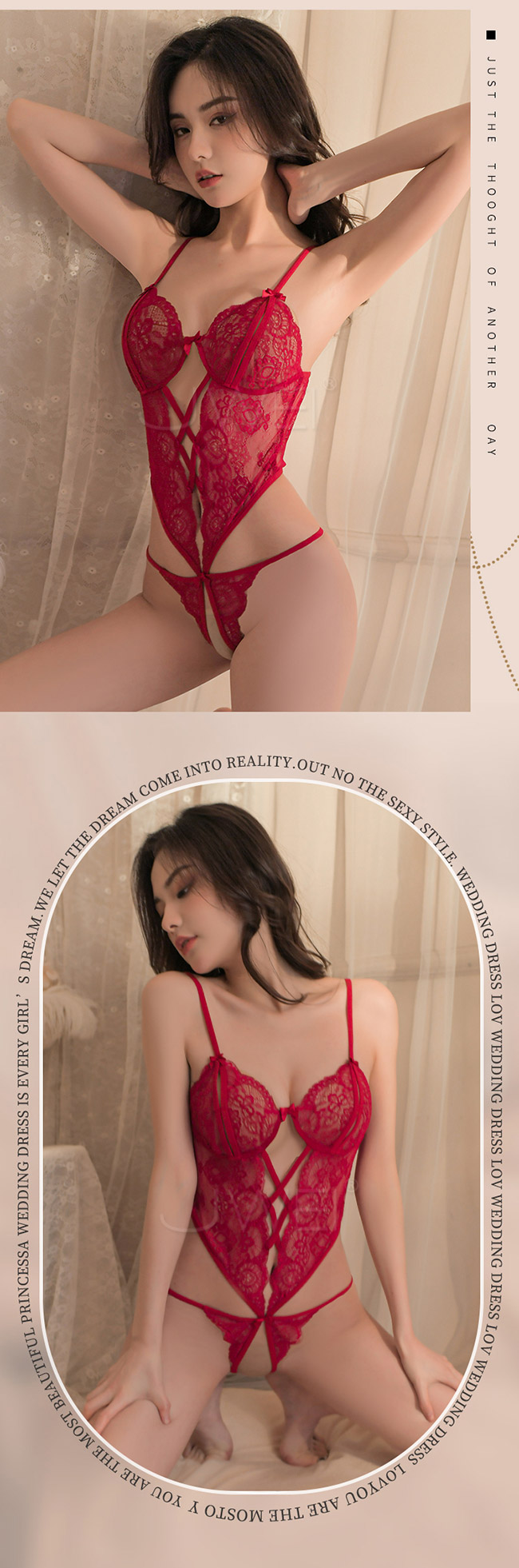 ◇◆巴黎夜未眠.性感蕾絲透視交叉細帶雙線開襠連體衣(紅色)◆◇