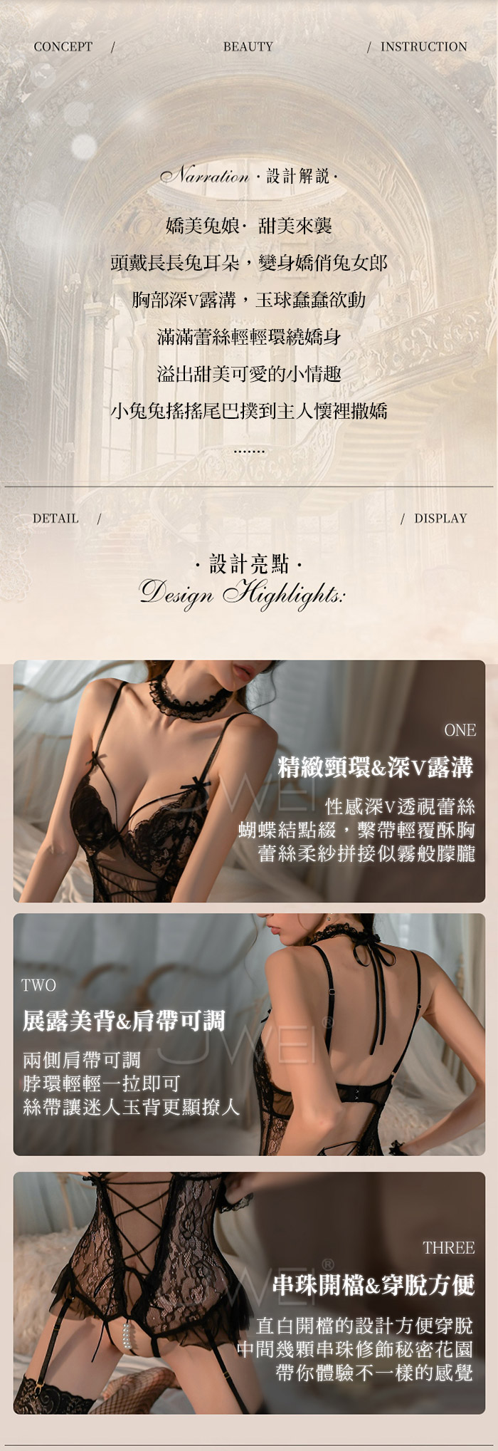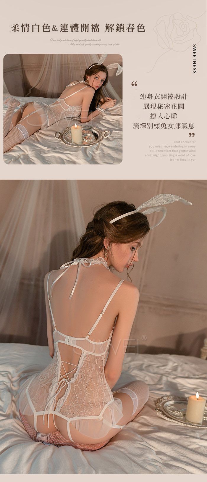 ►您現在的位置:首頁>嬌羞美兔.魅惑深V露溝美背珍珠開襠兔女郎四件套組-白色