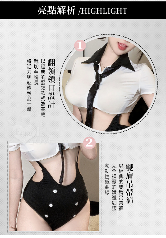 ►您現在的位置:首頁>女僕角色扮演服!翻領可開釦黑白撞色短上衣鏤空雙肩吊帶褲四件式套装