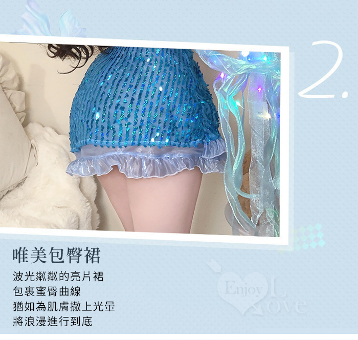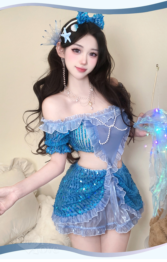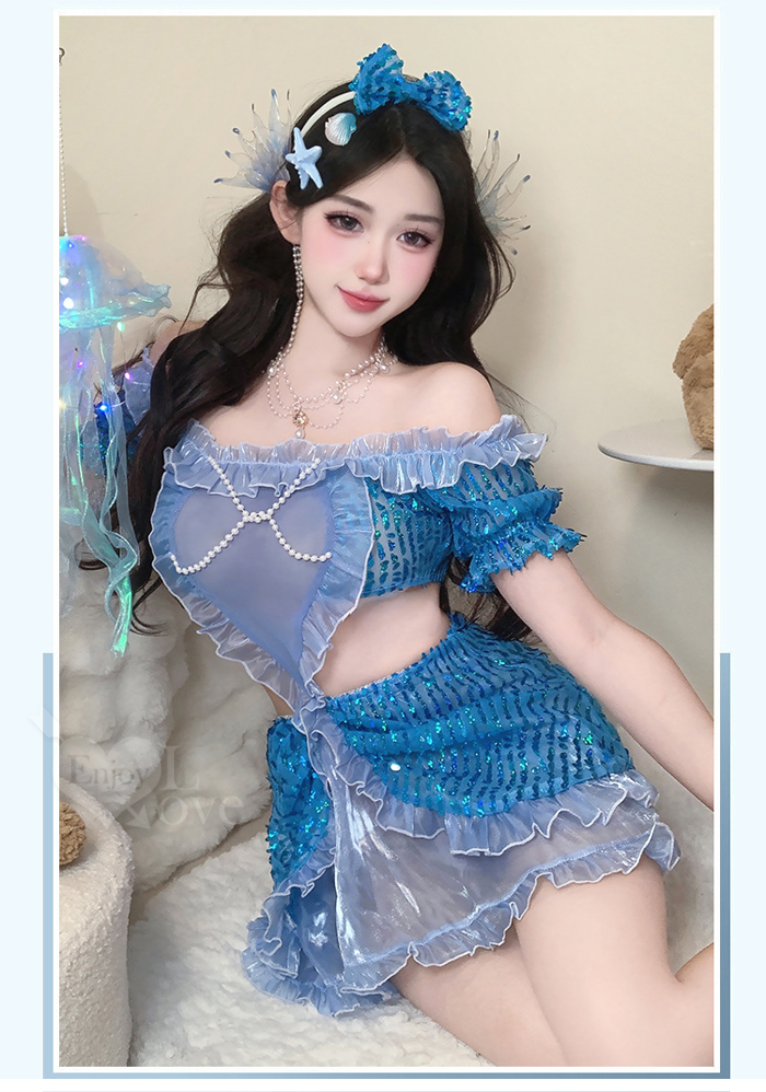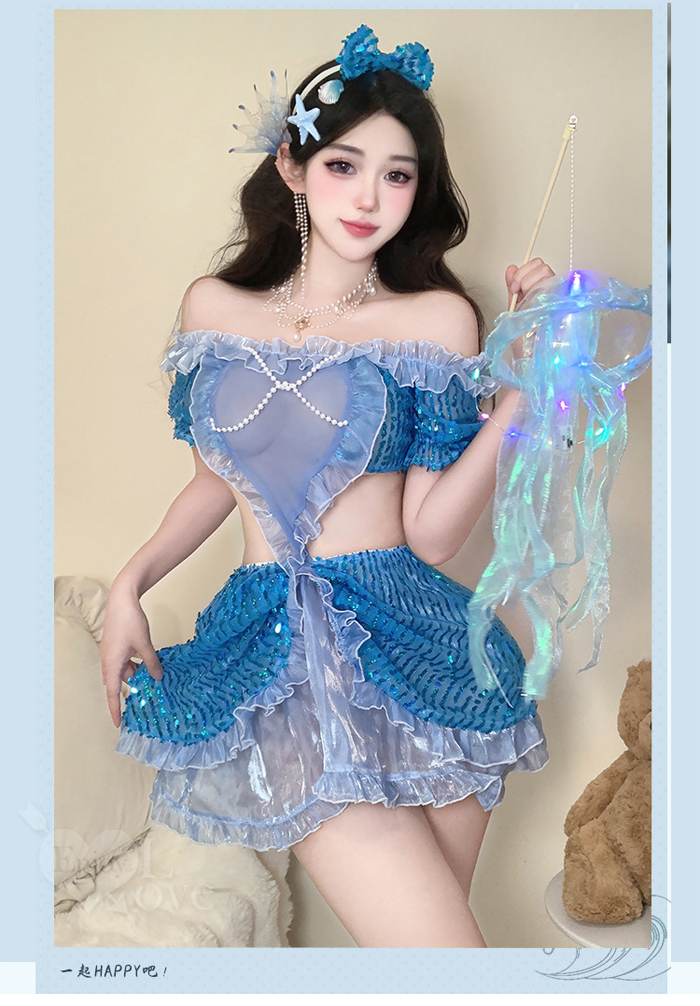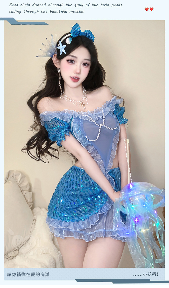 ►您現在的位置:首頁>美人魚角色扮演服!扭結珠鍊飾胸薄紗連結鏤空纖腰澎澎亮片連身裙三件組