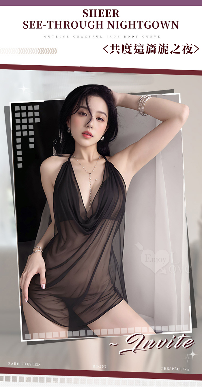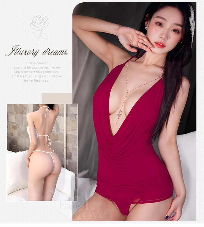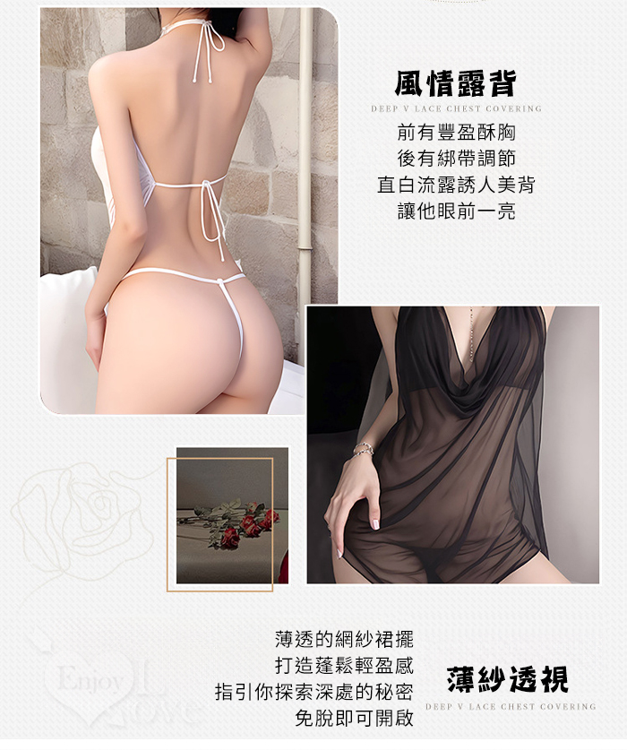 情趣睡衣!堆堆領露胸輕薄透紗綁脖後裸空繫帶兩件組﹝粉﹞