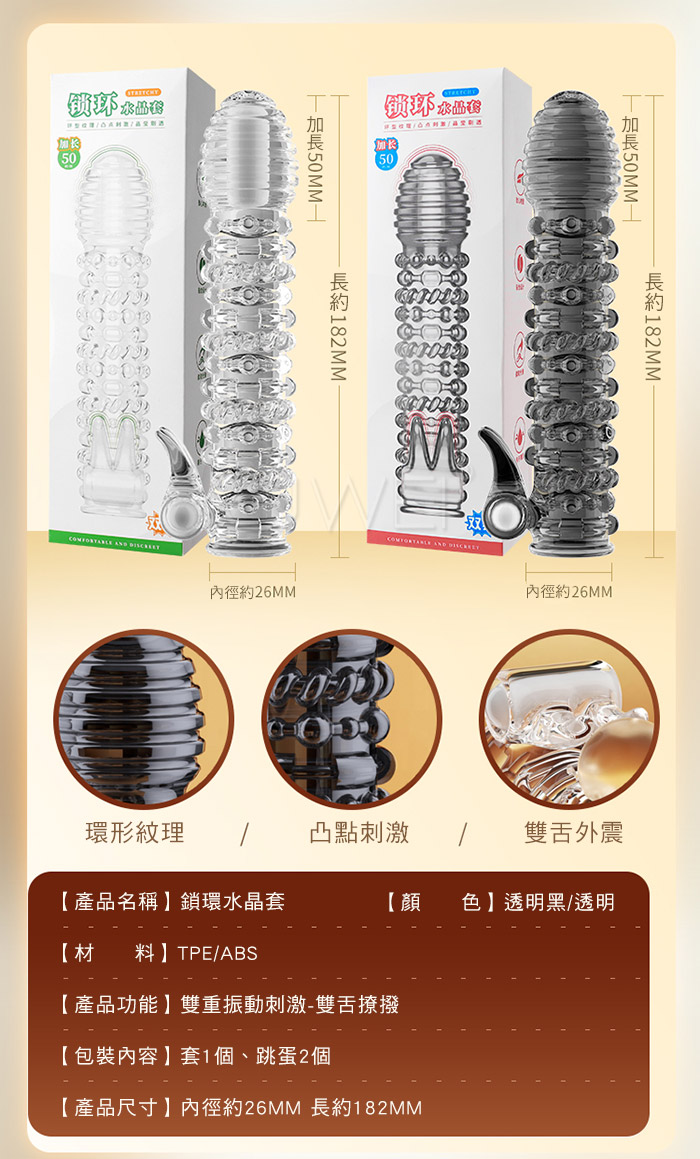 | 鎖環.雙舌撩撥 雙重震動刺激 環形紋理加長加粗水晶老二套【透黑】