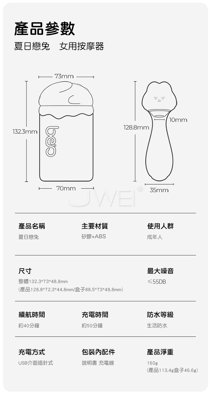 夏日戀兔吮愛激震,挑逗全身愉悅點,智能高潮新花樣 仿真吮吸技術,入門級友善體感,採用空氣負壓技術模凝人體吮吸的真空狀態 減少機械猛吸帶來的壓力痛威,譲吸吮更柔和,更舒適 入體強震,順滑進入掀起潮湧,人體工學設計,亞洲女性初次使用也自如〜 產品規格 ■尺寸:大小詳如圖片標示 ■材質:ABS ■功能:9頻震動、9頻吮吸、APP智控、加溫